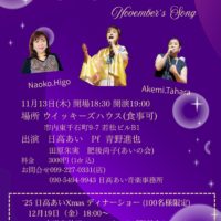 11月13日(木) 開場18:30 開演19:00 場所 ウイッキーズハウス(食事可)市内東千石町9-7 若松ビルB1 出演 日高あい Pf 青野進也 田原朱実 肥後尚子(あいの会) 料金 3000円 (1dr 込) お …